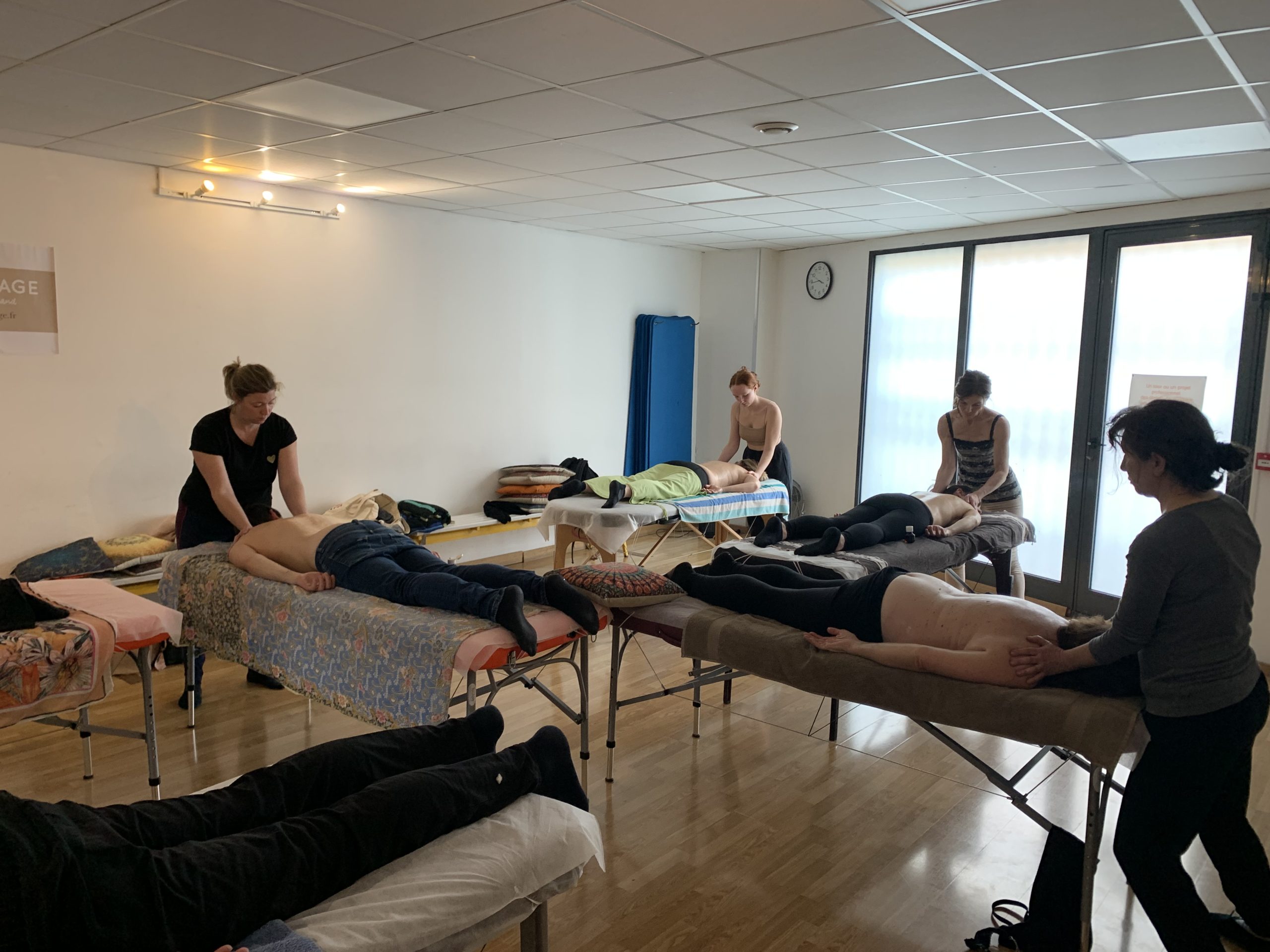 La validation du module 3 est encore l’occasion de revoir les personnes rencontrées durant la formation. Elle consiste en un massage de 20 minutes en présence de deux examinateurs. / La validation des module 3 consiste en un massage d’1h sur un(e) formateur-trice.